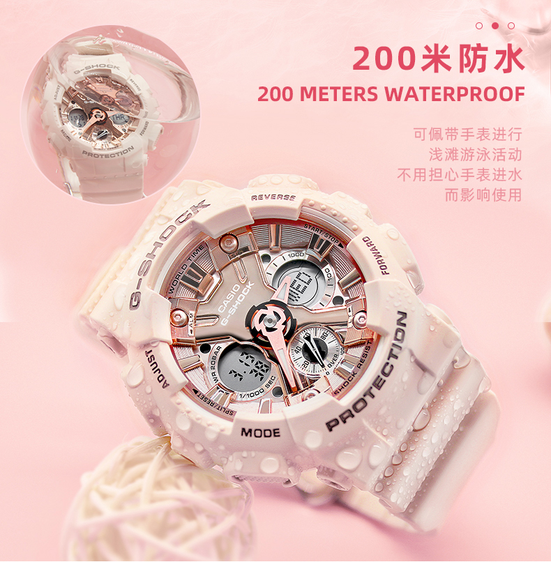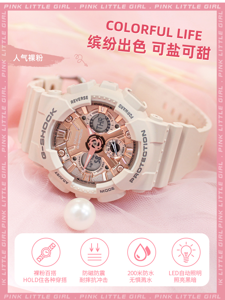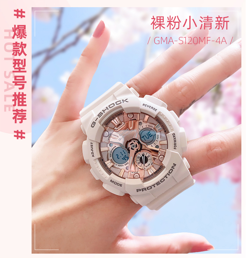 卡西欧手表官方女限量独白虎官网运动樱花粉GMA-S120旗舰店石英表